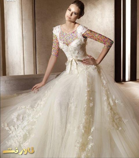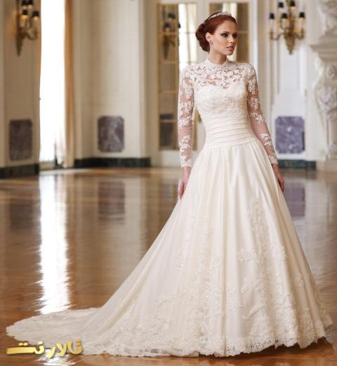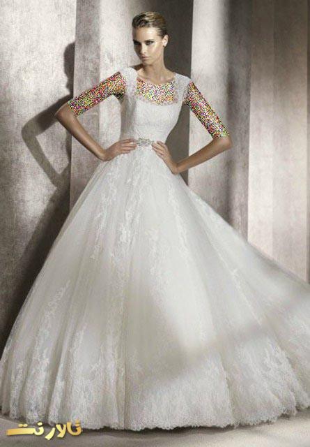 این مدل لباس عروس معروف به لباس عروس عربی است که در ایران نیز پر استفاده است. همانطور که در تصویر ملاحظه می کنید در این مدل از سنگهای تزئینی و زیبا استفاده شده و زیبایی خاصی به لباس عروس داده است.