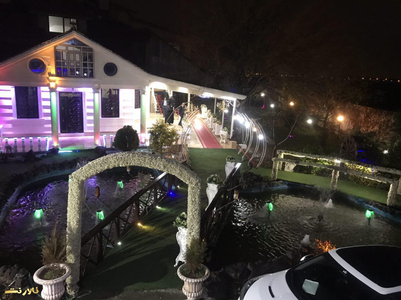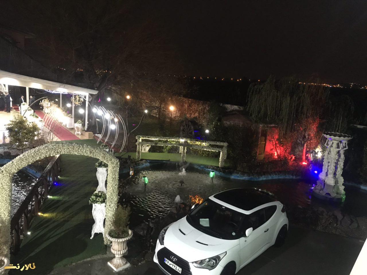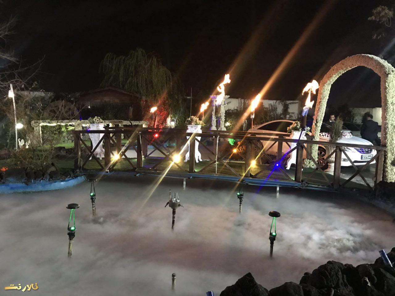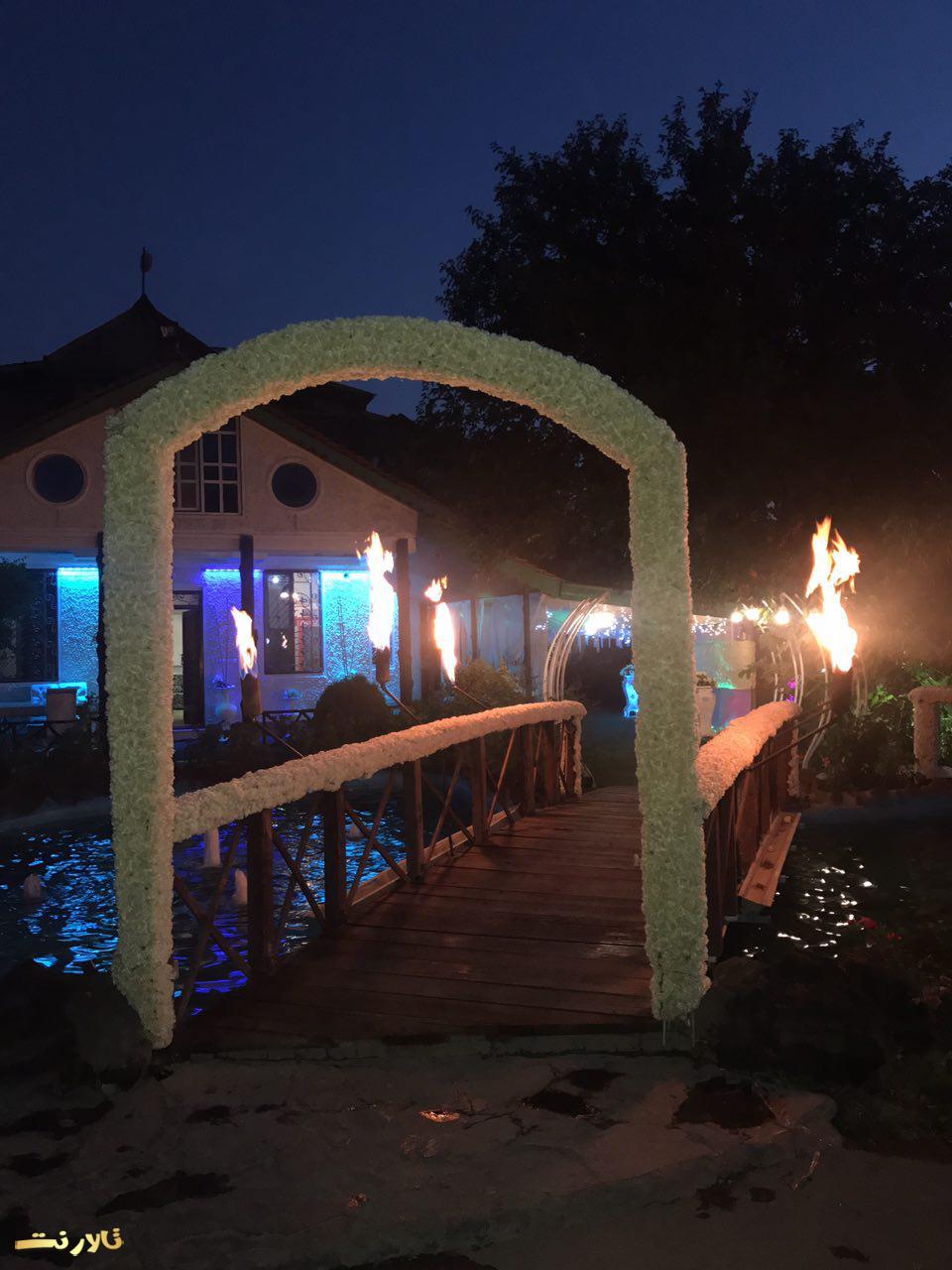 – محيط بيرون باغ تالار ازاستخر بزرگ والبته زيباو ٣ تاآبنما و يك رودخانه مصنوعی تشكيل شده كه عروس داماد و مهمان های محترم ازروى پل چوبی كه روی استخره رد ميشن و، وارده تونل ورودی ميشن كه اونجاهم كفش LED هست واطرافش هم پر از شمع ميشه