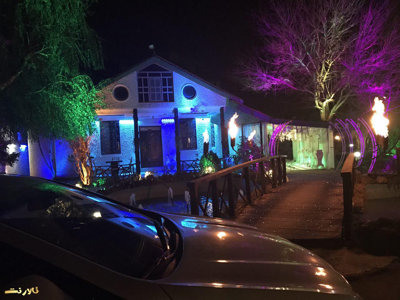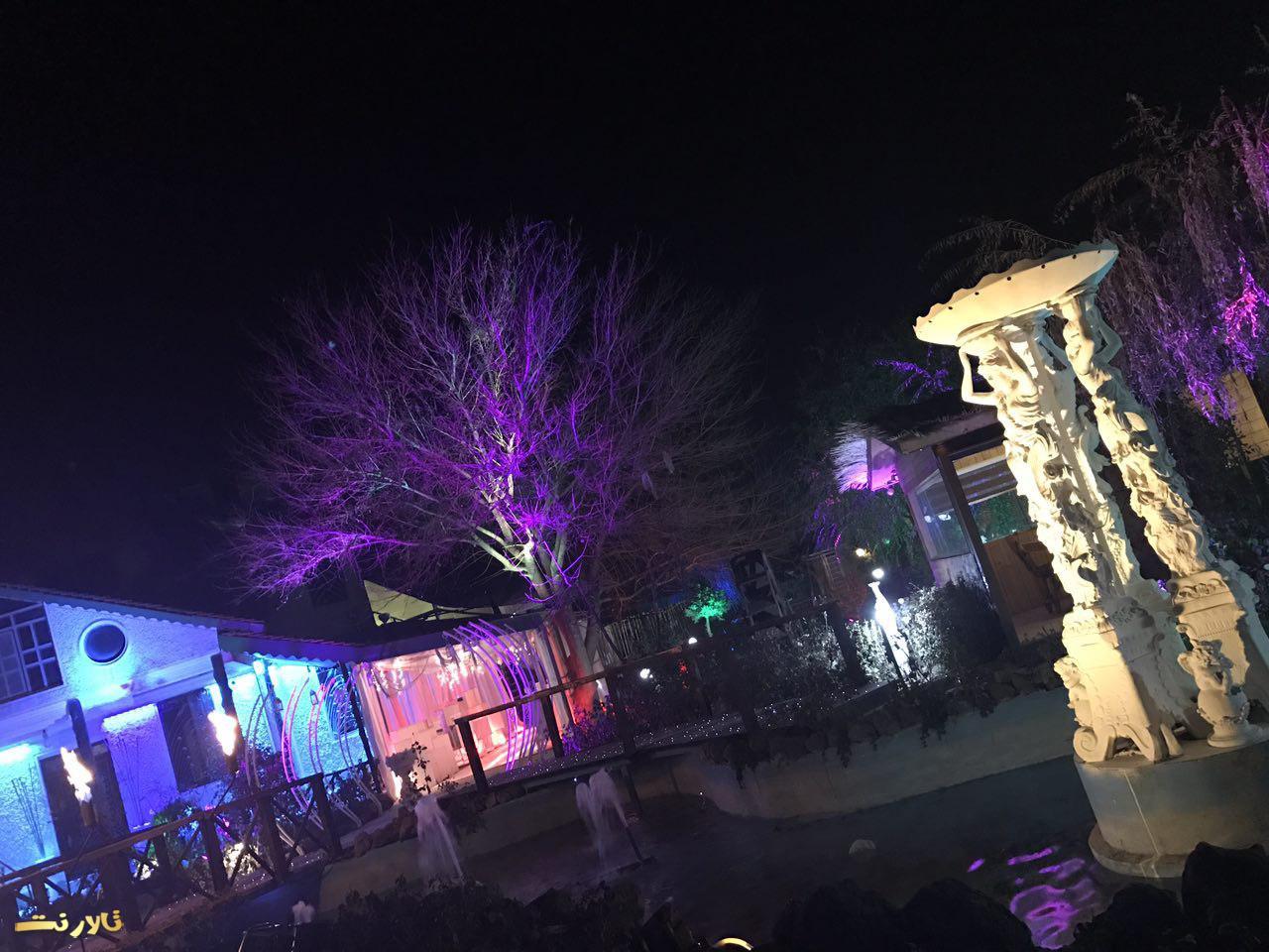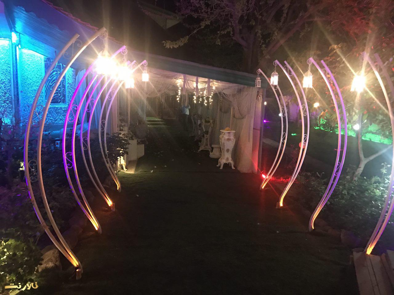 – محيط بيرون باغ تالار ازاستخر بزرگ والبته زيباو ٣ تاآبنما و يك رودخانه مصنوعی تشكيل شده كه عروس داماد و مهمان های محترم ازروى پل چوبی كه روی استخره رد ميشن و، وارده تونل ورودی ميشن كه اونجاهم كفش LED هست واطرافش هم پر از شمع ميشه