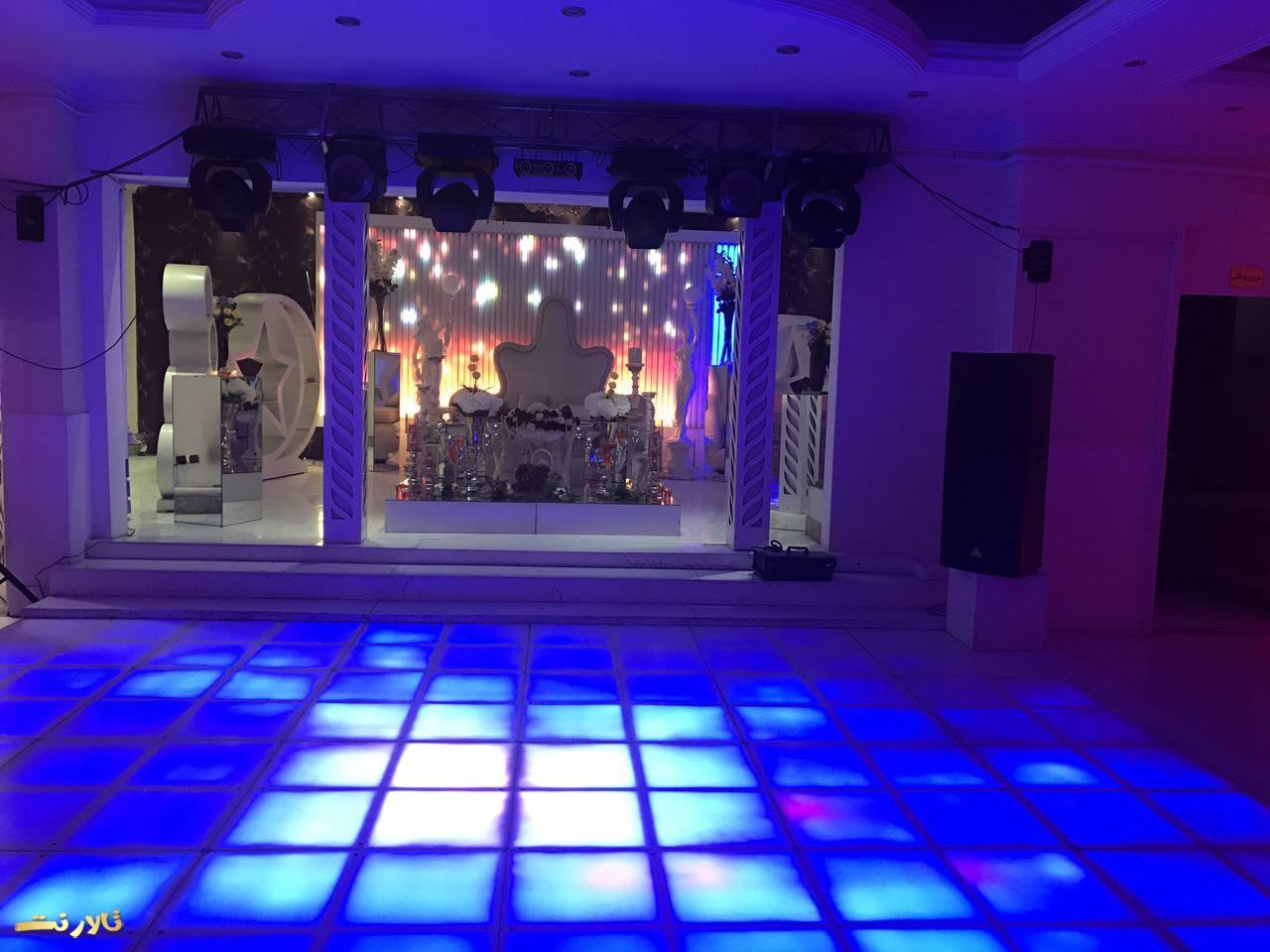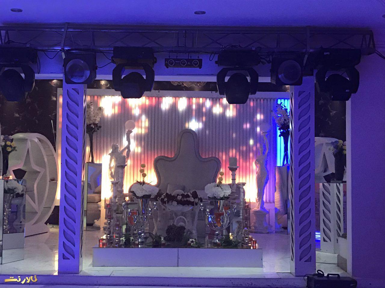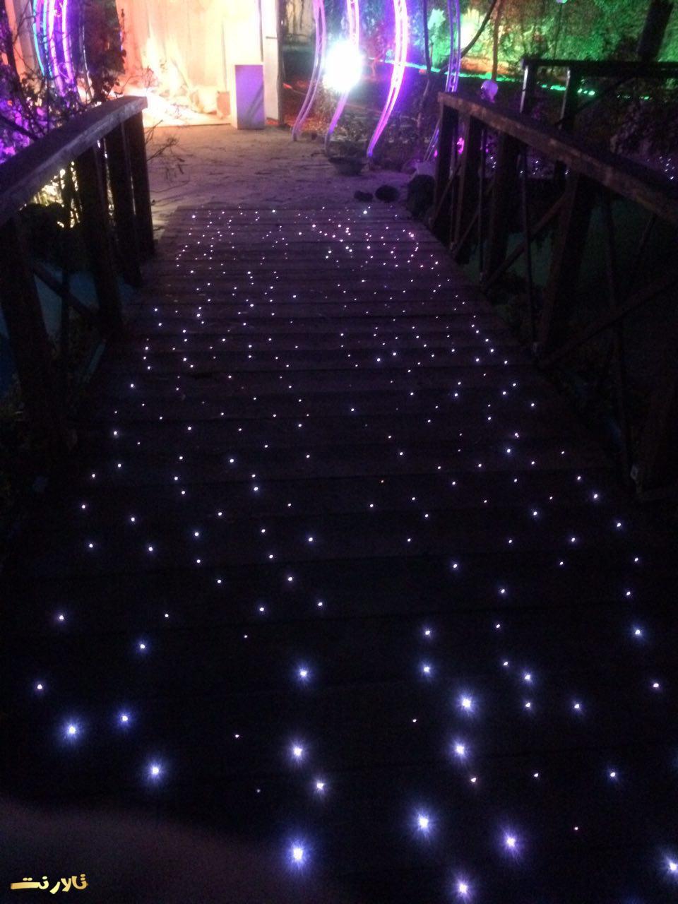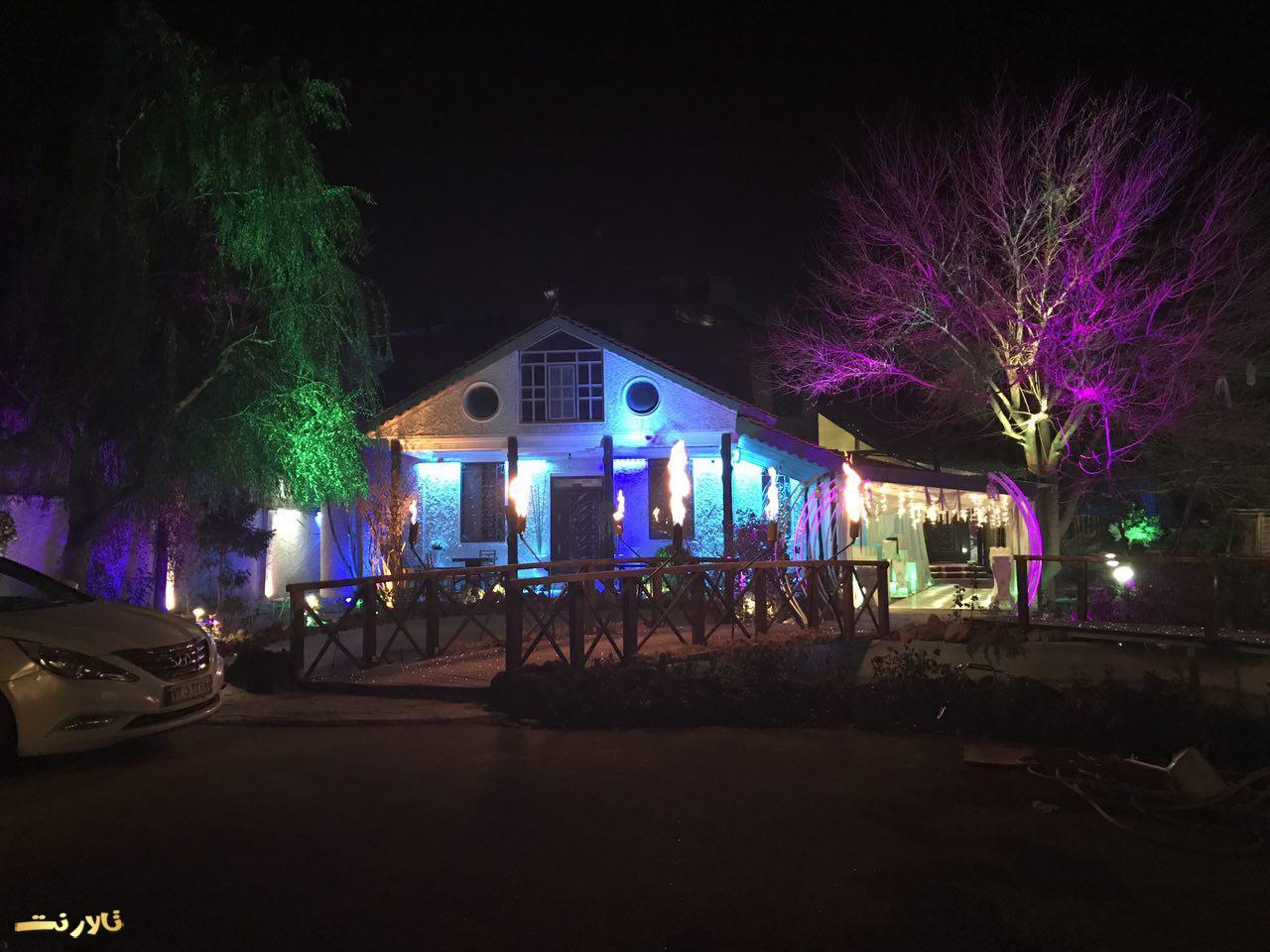 – محيط بيرون باغ تالار ازاستخر بزرگ والبته زيباو ٣ تاآبنما و يك رودخانه مصنوعی تشكيل شده كه عروس داماد و مهمان های محترم ازروى پل چوبی كه روی استخره رد ميشن و، وارده تونل ورودی ميشن كه اونجاهم كفش LED هست واطرافش هم پر از شمع ميشه