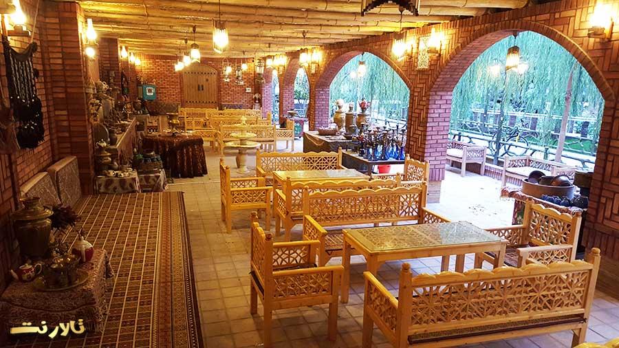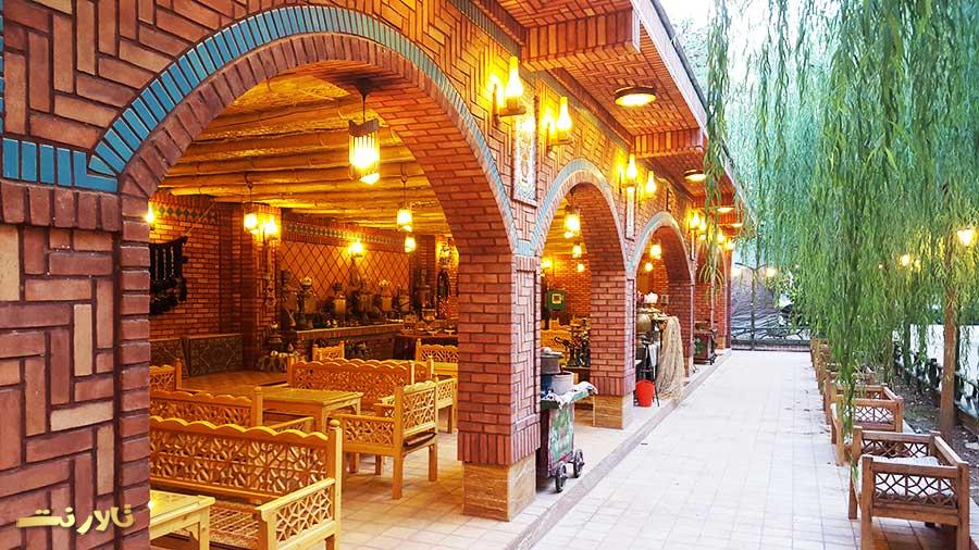 همچنین این مجموعه دارای یک سفره خانه سنتی بزرگ با معماری و تجهیزات کاملا قدیمی و چشم اندازی زیبا از فضای سبز و انبوهی از درختان بید میباشد که فضایی کاملا رویایی را برای شما ایجاد کرده و مشابه آن در بین کل باغ تالارها بی نظیر میباشد.